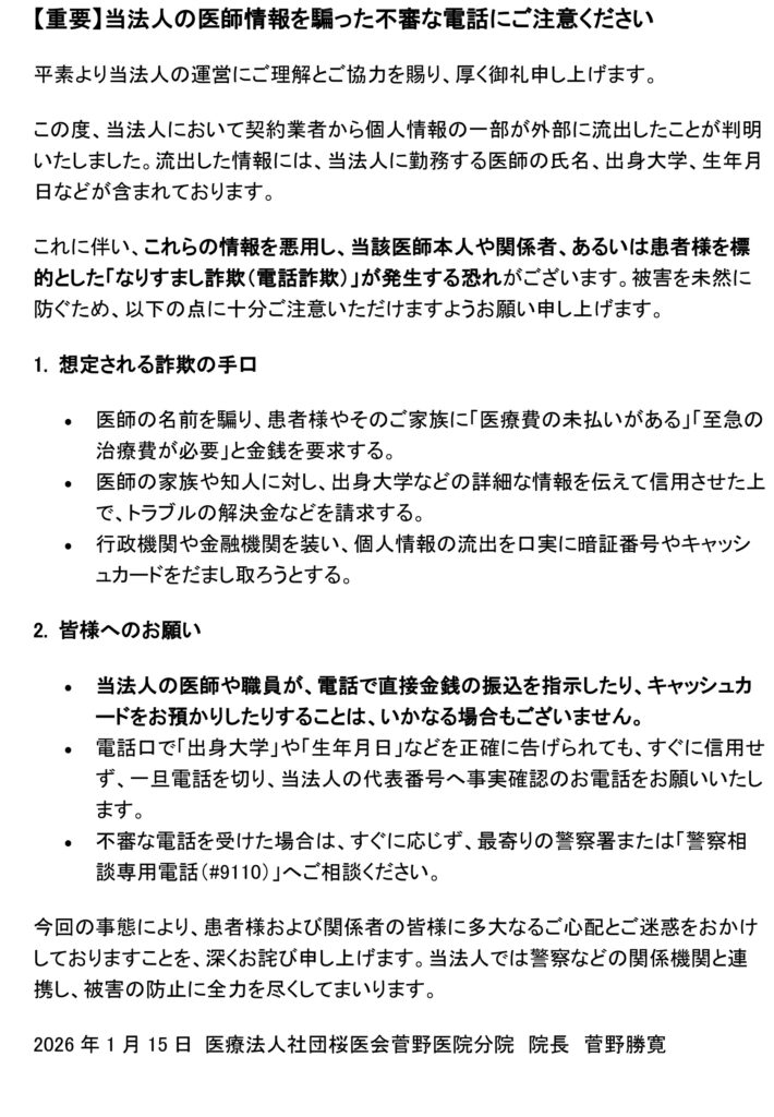 【重要】当法人の医師情報を騙った不審な電話にご注意ください